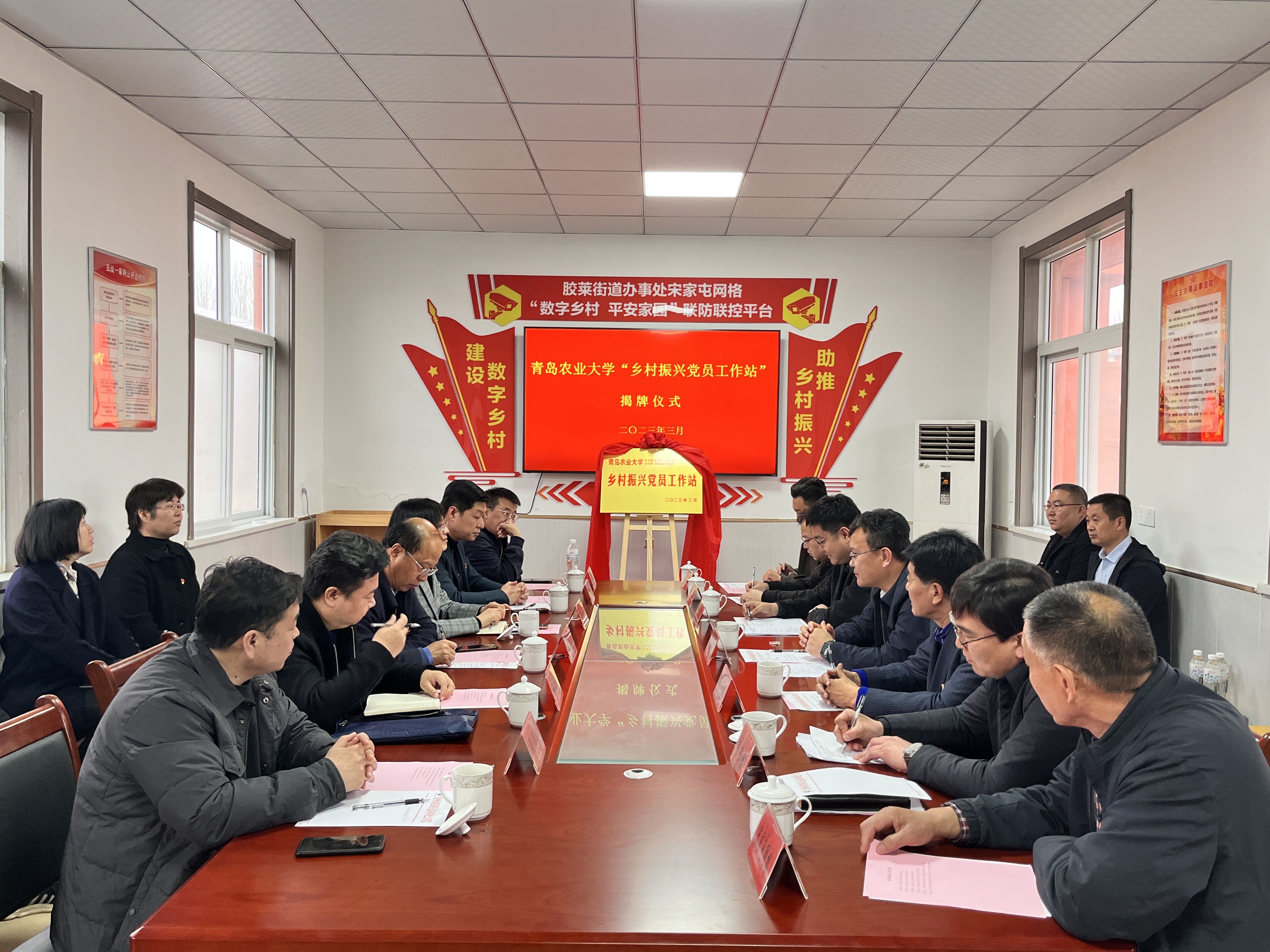 为进一步提升基层党建工作水平,实现校地党建资源共建共享,3月22日,beat365平台官方网站机关一财务处党支部书记、处长蒋家慧,beat365平台官方网站党委书记马伟萍,财务处副处长孙显峰,beat365平台官方网站第二(教工)党支部书记张恩盈及部分师生代表一行赴胶莱街道宋家屯参加“乡村振兴党员工作站”揭牌仪式。胶州市省派驻村第一书记和工作队队长张原生、刘文星,胶莱街道党工委书记刘井哲,党工委副书记刘旭东,胶莱乡村振兴工作队队长吴焕明、刘福临等一同参加仪式。仪式由胶莱街道党工委副书记刘旭东主持。