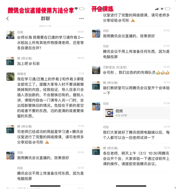 3月2日,网络教学工作正式开启。每位教师授课后,都会在教研室群里分享经验和感受。目前,群里关于在线授课的讨论和分享已超过500条。通过开课前的模拟演练和真正线上教学的实践,总结了一系列实用干货经验,如超星直播可以在线视频直播,也可以“屏幕共享+声音直播”;直播结束后要点击保留视频,方便同学回看自主学习;学习通签到比QQ群签到更易保留教学记录,建议用学习通签到等。