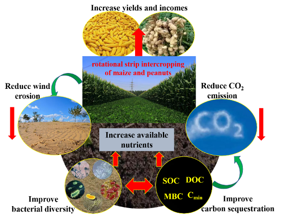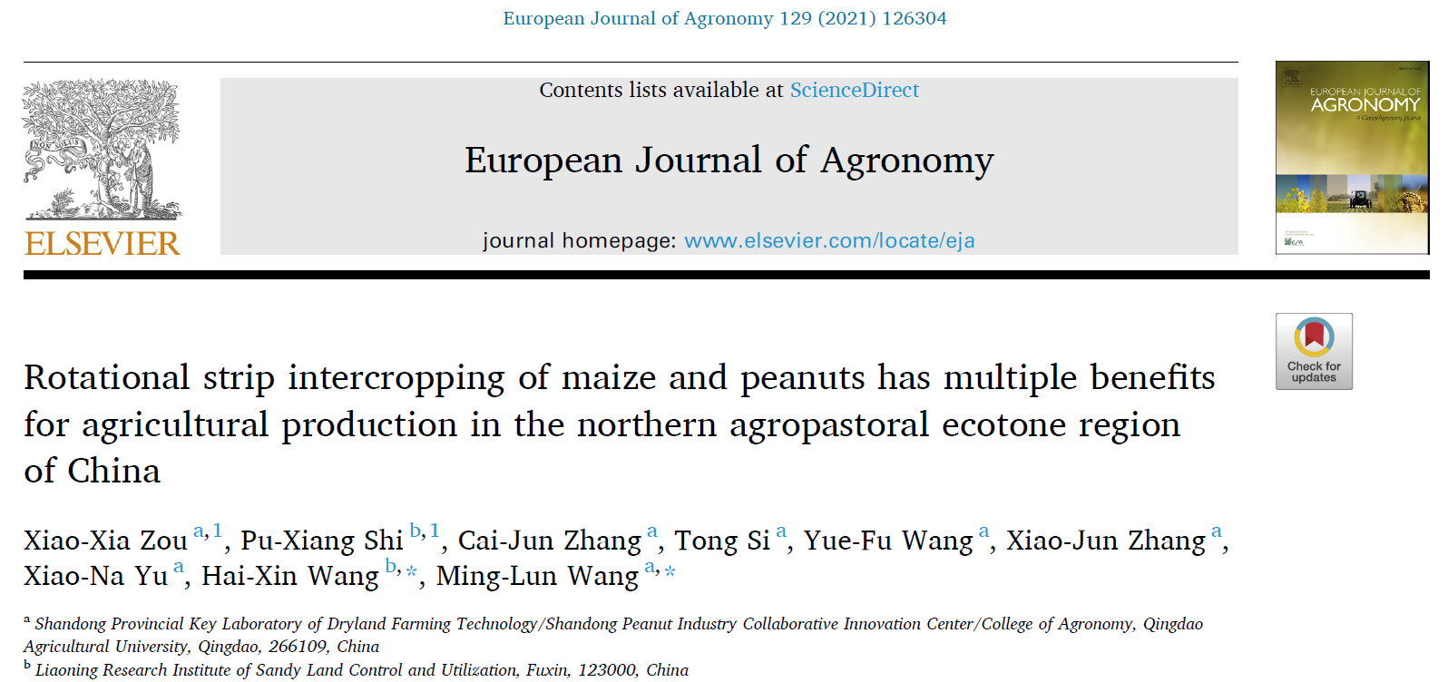 北方农牧交错带是半湿润地区与半干旱地区的气候交汇带,是我国中东部地区重要的生态安全屏障和京津冀地区重要的水源涵养带,是一类重要的农业空间,探索适宜该地区的可持续农业生产方式至关重要。研究基于4年定位试验,系统研究了玉米连作、花生连作和玉米花生带状轮作3种种植方式的土壤特性、作物生产力和生态效应。结果表明,玉米花生带状轮作具有多重效益,较玉米和花生连作可显著提高土壤微生物丰度和群落多样性、改善土壤碳库特征、提升养分有效性,同时,明显降低土壤侵蚀和由侵蚀导致的碳排放;耕层土壤碳库特征的改善和养分有效性的提升与间作系统作物产量的提高密切相关。本研究相关结果发表在European Journal of Agronomy,beat365平台官方网站邹晓霞副教授和王铭伦教授分别为论文的第一作者和通讯作者(图1)。