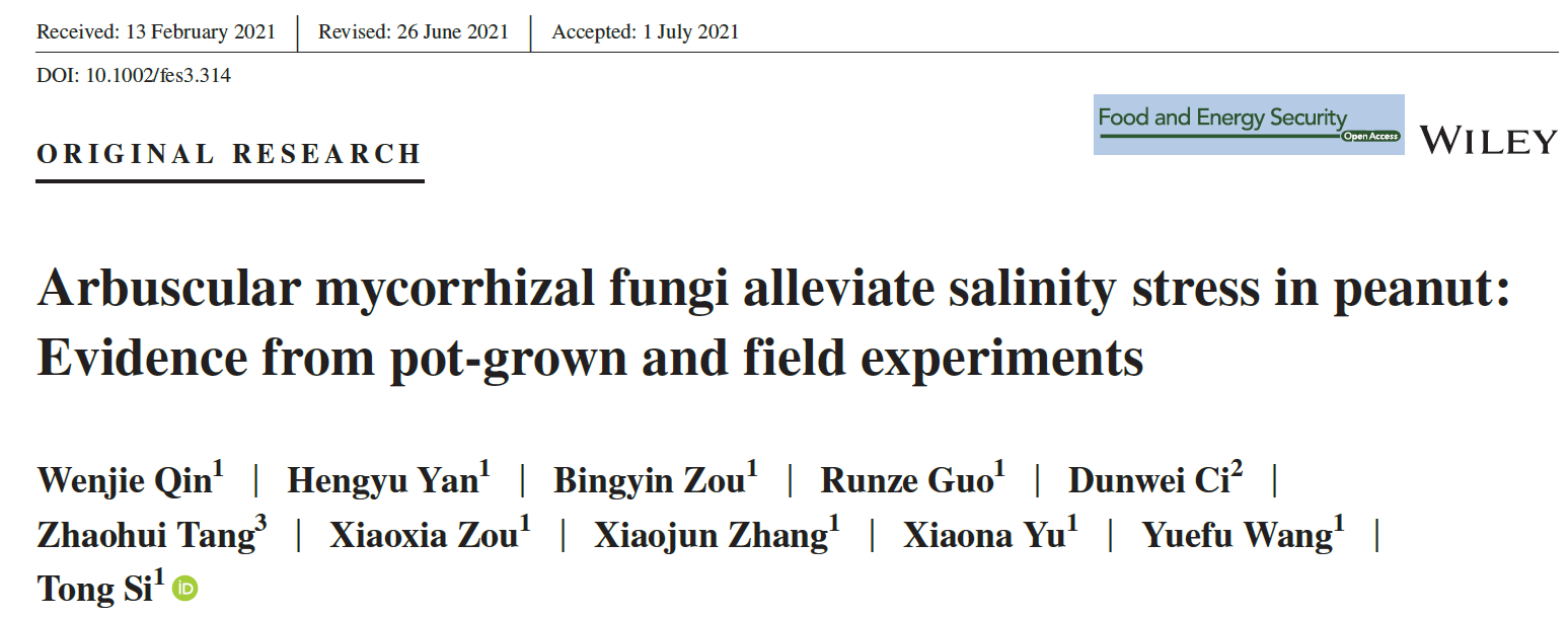 花生是山东省的主要经济作物和我国的重要出口作物。通过接种丛枝菌根真菌(AMF)与花生共生,进而提高花生幼苗素质和耐盐性,是实现用地养地相结合、促进我省滨海盐碱地花生产业可持续发展的重要途径。课题组对花生接种了一种新型配方的AMF进行预处理,开展了盆栽试验和两年大田试验。生理数据分析表明,AMF显著提高了盐胁迫下花生叶片净光合速率、叶绿素荧光相关参数、抗氧化酶活性、渗透调节物质含量,提高了花生地上部分和地下部分的生物量。转录组数据分析表明,AMF处理显著提高了盐胁迫下花生根系抗氧化系统和多种代谢途径的基因表达水平。大田试验进一步证明,接种AMF处理显著提高了盐碱地和非盐碱地花生籽粒蛋白质含量及总产量。本研究为在大田条件下推广该新型AMF提高花生耐盐性和产量提供了理论依据和技术支撑。本研究相关结果发表在Food and Energy Security,beat365平台官方网站硕士研究生秦文洁、青年教师闫恒宇博士和司彤博士分别为第一作者、共同第一作者和通讯作者(图2)。