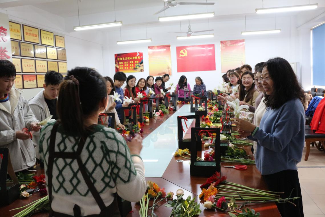 张玉梅首先向学院女教职工致以节日的问候,随后,插花老师向大家细致地讲解各类花型和每种插花表达的意境,并亲手示范如何插花,将中国传统的插花艺术生动地展现在每位女教职工面前。各位女教职工在老师的悉心指导下,发挥创造力,整合造型,用自己灵巧的双手,将原本普普通通的玫瑰、康乃馨、紫罗兰、太阳花、水晶草等各色花卉,修剪、整枝,根据每个人各自的喜好搭配在一起,错落有致。