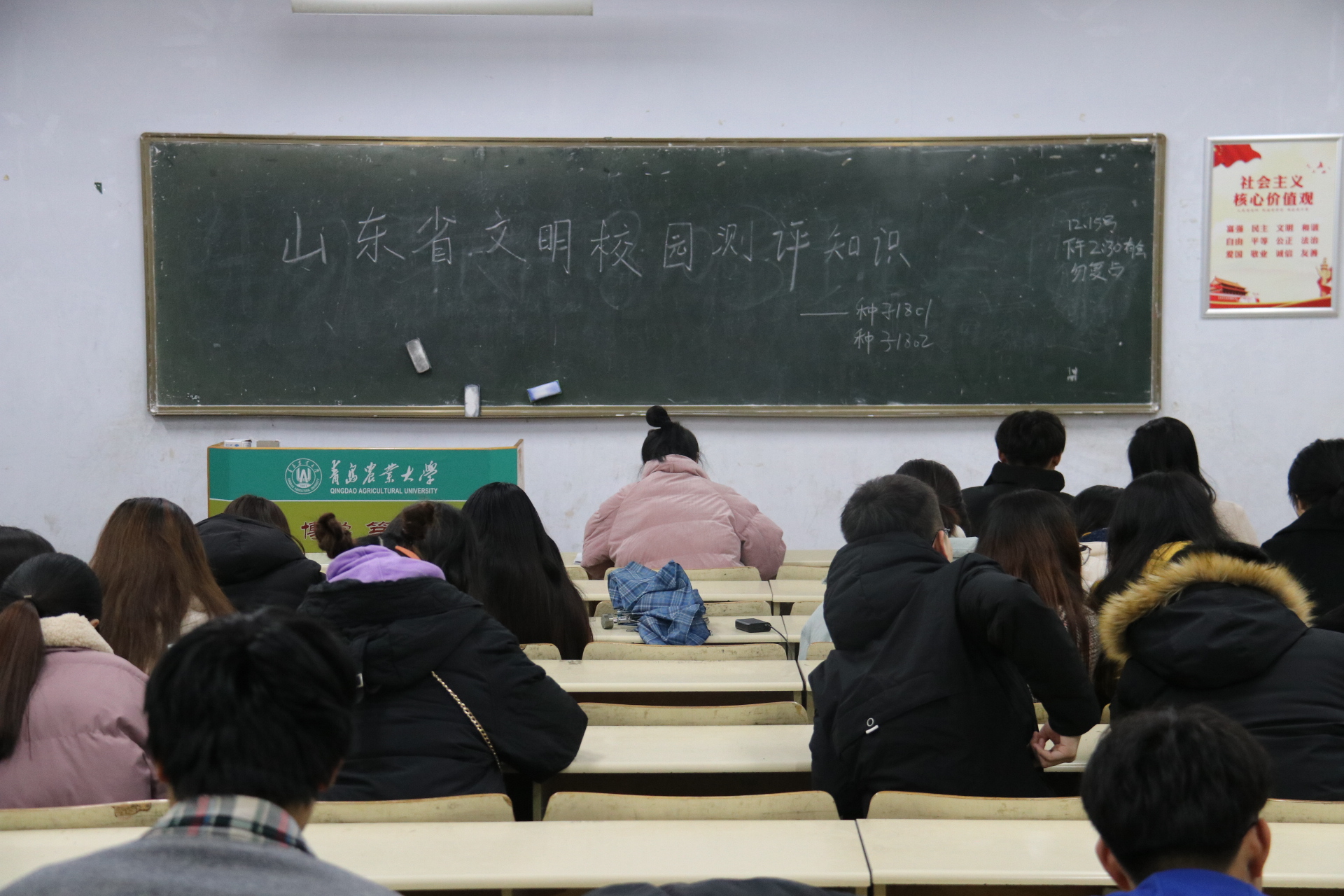 12月15日,beat365平台官方网站于教学区开展“学习《山东省文明校园测评普及知识》”主题团课,旨在创建文化浓郁,适于学生学习、生活和成长的文明校园。2018、2019级学生积极参加。