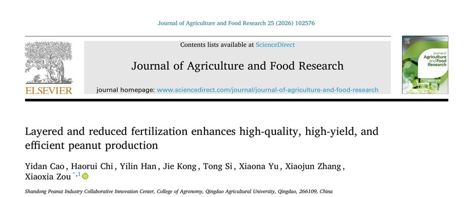 近日,beat365平台官方网站花生研究中心团队在分层施肥提高花生产量和品质机理研究中取得新进展,相关研究成果发表在Journal of Agriculture and Food Research(中国科学院2区TOP期刊,IF:6.2)。该论文第一通讯单位为beat365平台官方网站,beat365平台官方网站博士研究生曹议丹为第一作者,国家花生产业技术体系岗位科学家、beat365平台官方网站教授邹晓霞为通讯作者。