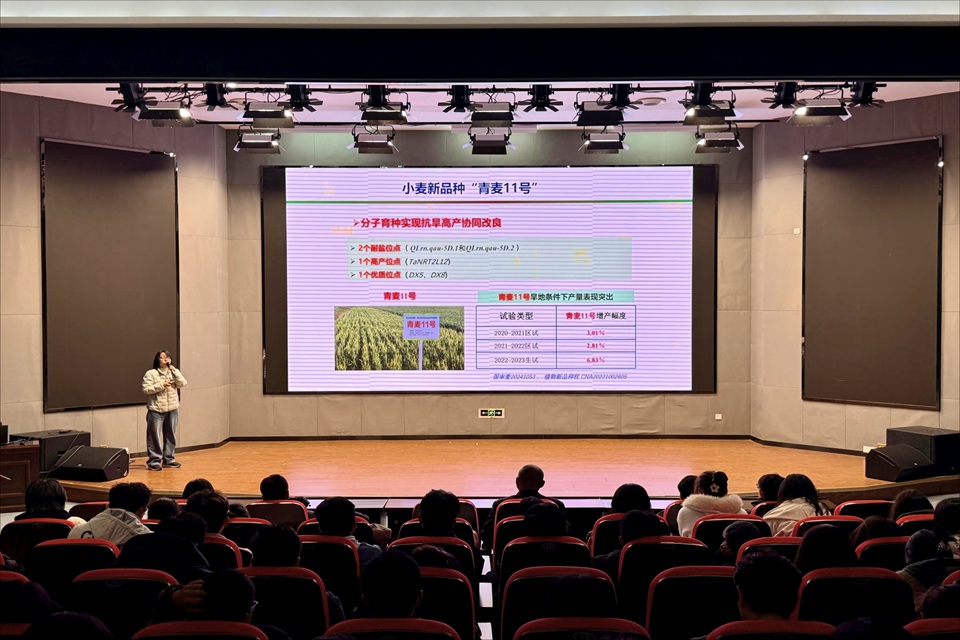 活动伊始,郭卫卫在博学楼报告厅开启“理论课堂”。以“粮食安全”为切入点,深入剖析我国粮食生产面临“资源短缺”与“环境恶化”两大挑战,指出培育优良作物品种在国家发展战略中的核心地位。随后,郭卫卫以小麦为例,系统介绍其生长发育特性与田间管理技术要点,并围绕优质品种“青麦11号”进行重点讲解。郭卫卫指出该品种经多年培育优化,兼具抗旱耐盐能力强及高产、抗倒伏、抗病虫害、稳产性佳、适应性广等优势,是适配山东地区气候与土壤条件的标杆品种之一,其推广价值已获山东教育卫视、青岛广播电视台、城阳电视台等多家权威媒体的广泛报道。在“秾华耕苑”教学实践与劳动教育基地,郭卫卫围绕冬小麦种植的关键环节展开讲解,重点介绍精细整地、优种包衣、适期播种、肥水冬管、病虫早防等种植要点。郭卫卫亲自示范并带领同学们开展“青麦11号”小麦实地种植,从整地、开沟到播种、覆土,郭卫卫一边操作,一边细致讲解播种深度、行距控制、水肥管理等技术要点和注意事项。在老师的指导下,同学们亲手将一粒粒饱满的麦种播入土壤,也在实践中埋下对丰收的期待。